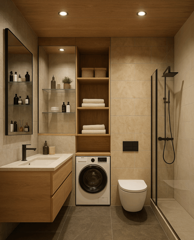 Маленькая ванная требует точности. Встроенная стиральная машина, полки в нишах и большая зеркальная поверхность помогают использовать каждый сантиметр с пользой. Контраст холодных и тёплых оттенков, а также сочетание дерева и камня делают интерьер сбалансированным и уютным.