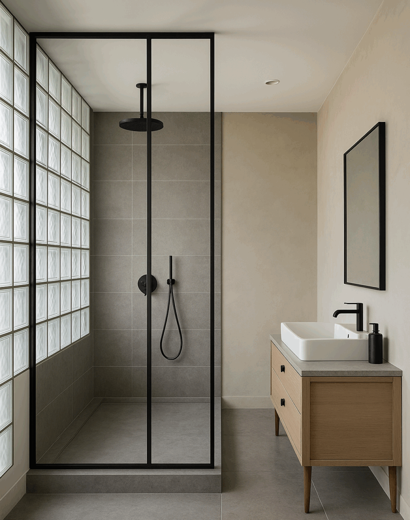 Откажитесь от глухих перегородок и используйте прозрачные материалы стеклянные блоки, зеркала, лёгкие перегородки. Они визуально увеличивают пространство и создают интересную игру света. Душевой поддон из бетона или керамогранита придаст интерьеру современный, «архитектурный» характер.