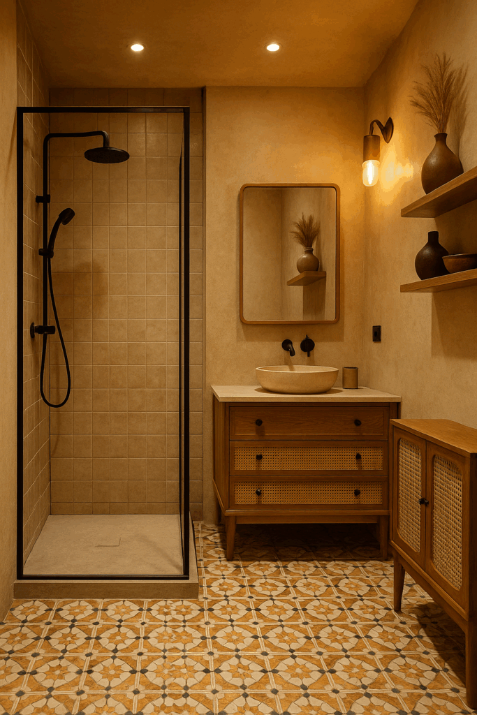 Если хочется добавить характер, используйте мотивы восточного декора. Мозаика на полу, песчаные оттенки, тёплый свет и ротанговые фасады мебели создают атмосферу уюта и тепла. Такой интерьер будет выглядеть уникально даже на минимальной площади.