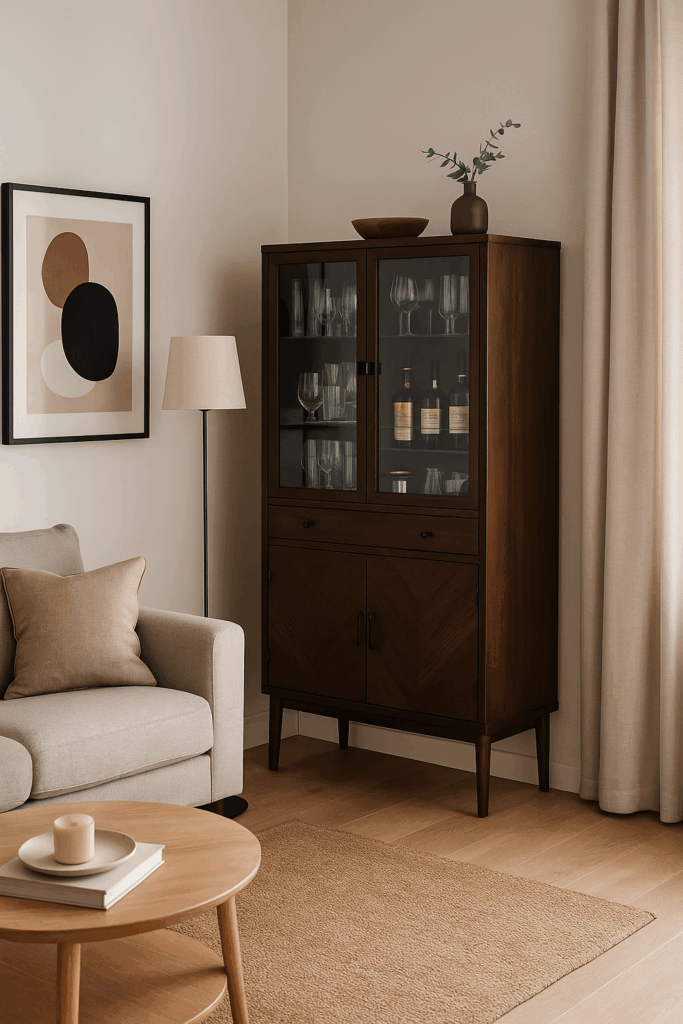 Если основное хранение вынесено в другие помещения, можно добавить в гостиную эффектный шкаф-бар. Он не только функционален, но и станет изюминкой интерьера, особенно в праздничные вечера.
