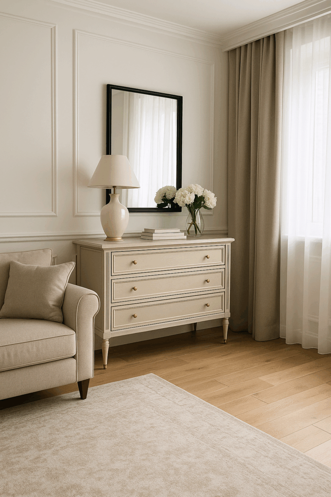Если хочется немного классики, обратите внимание на изящные комоды. Модель на ножках создаёт ощущение лёгкости, не загромождает комнату и при этом остаётся вместительной. Такой вариант хорошо смотрится в интерьерах с элементами неоклассики.