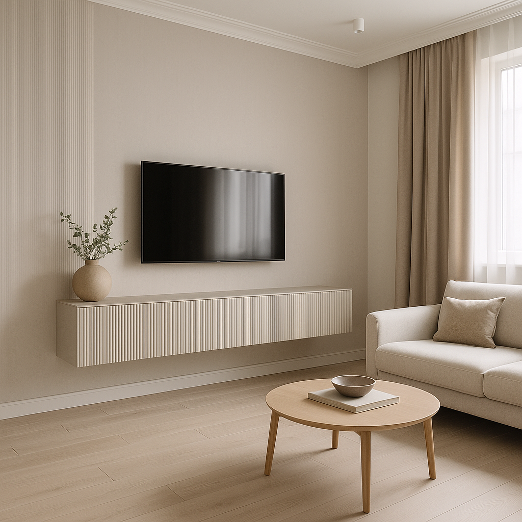 Отличный выбор для тех, кому не нужно много мест хранения. Подвесная тумба под телевизор выглядит невесомо, а свободное пространство под ней визуально расширяет комнату. В одном из проектов дизайнер использовала модель с рифлёными фасадами в цвет стен решение получилось лаконичным и современным.