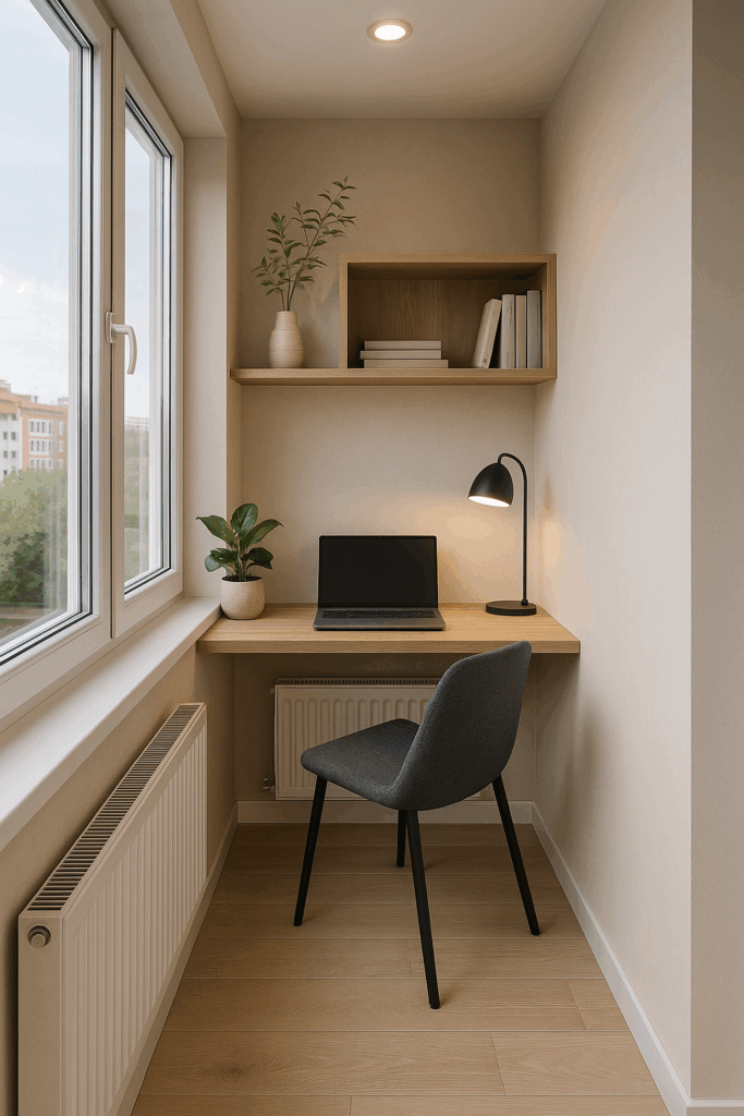 Балкон или лоджия — отличная возможность добавить в квартиру ещё одну функциональную зону. После утепления и установки освещения это пространство превращается в полноценный кабинет. Здесь всегда достаточно света, тишины и свежего воздуха. Это особенно удобно для тех, кто хочет работать в уединении, не мешая остальным.