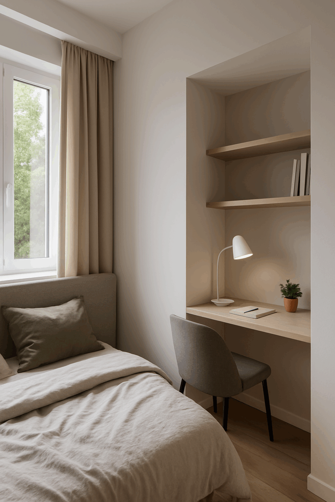 Даже в небольшой спальне можно организовать уютное рабочее место. Поставьте узкий стол вдоль окна или используйте нишу для встроенного стола. Добавьте настольную лампу и мягкий стул — и получится тихий уголок для работы или учёбы, не загромождающий пространство.