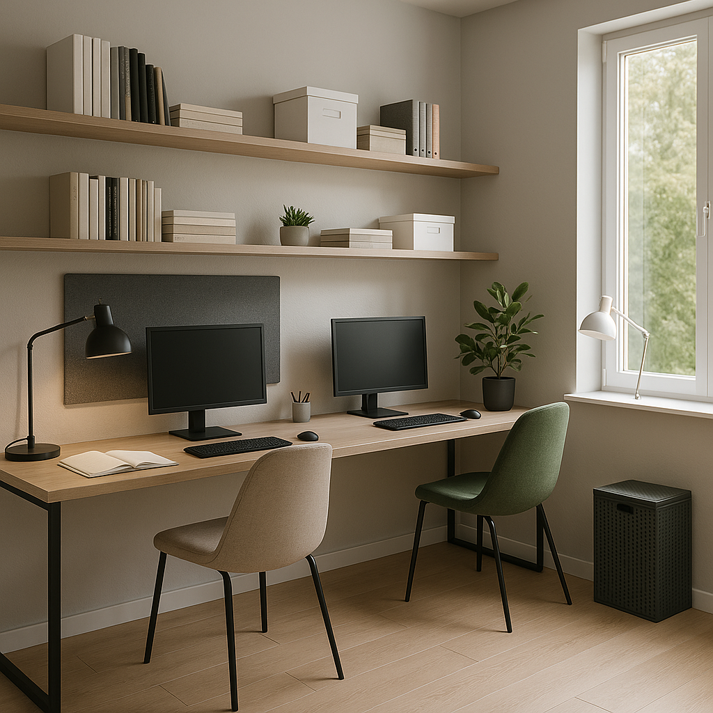 Если в квартире нет возможности оборудовать два отдельных кабинета, можно объединить рабочие места. Например, поставить столы параллельно или установить один длинный стол вдоль стены. Главное — позаботиться о равномерном освещении и личном комфорте. Чтобы рабочие зоны не мешали друг другу, можно добавить перегородку, зелёное растение или просто использовать разные стулья и лампы — это создаст ощущение разделения пространства.