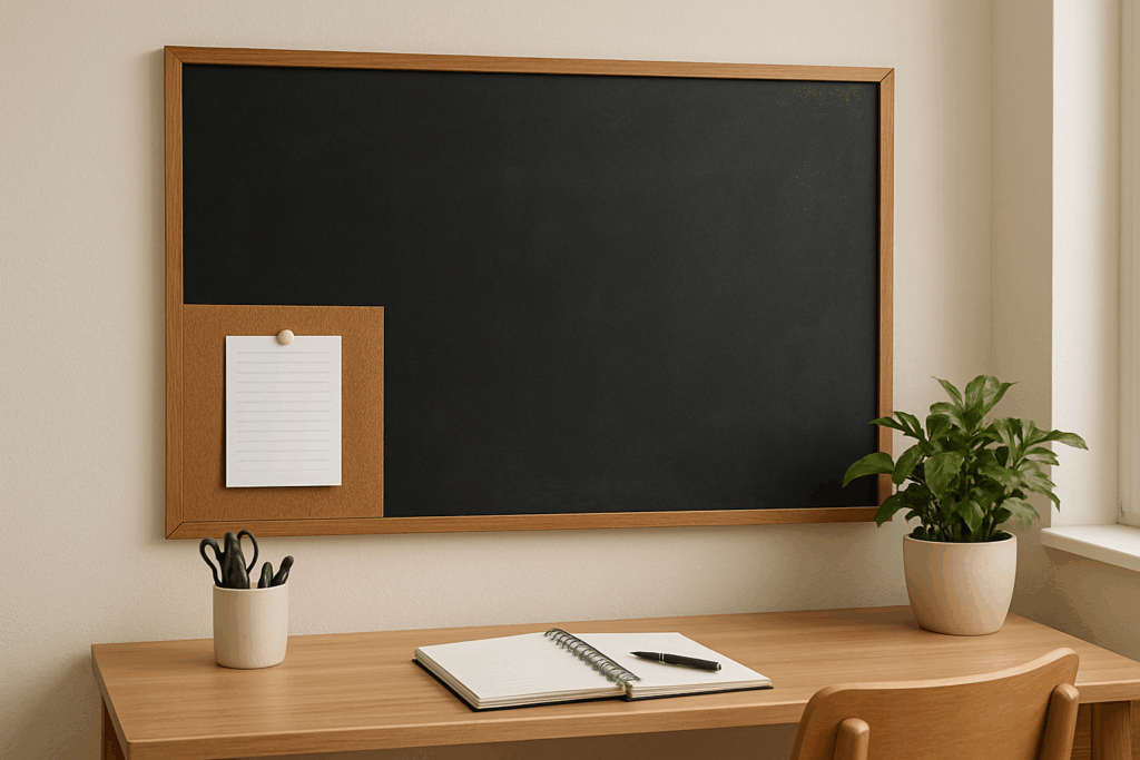 Если пространство позволяет, имеет смысл повесить рабочую доску рядом со столом. Это может быть магнитная, пробковая поверхность или стена, покрытая краской для мела. На доске удобно фиксировать расписание, планы, памятки и списки дел — всё важное всегда остаётся перед глазами.
