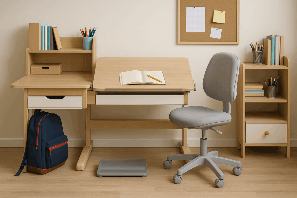К рабочему месту можно добавить полки, выдвижные ящики и боковой крючок для школьного рюкзака. Подставка для ног и удобное расположение письменных принадлежностей помогают сохранять правильную посадку и уменьшают нагрузку на спину.