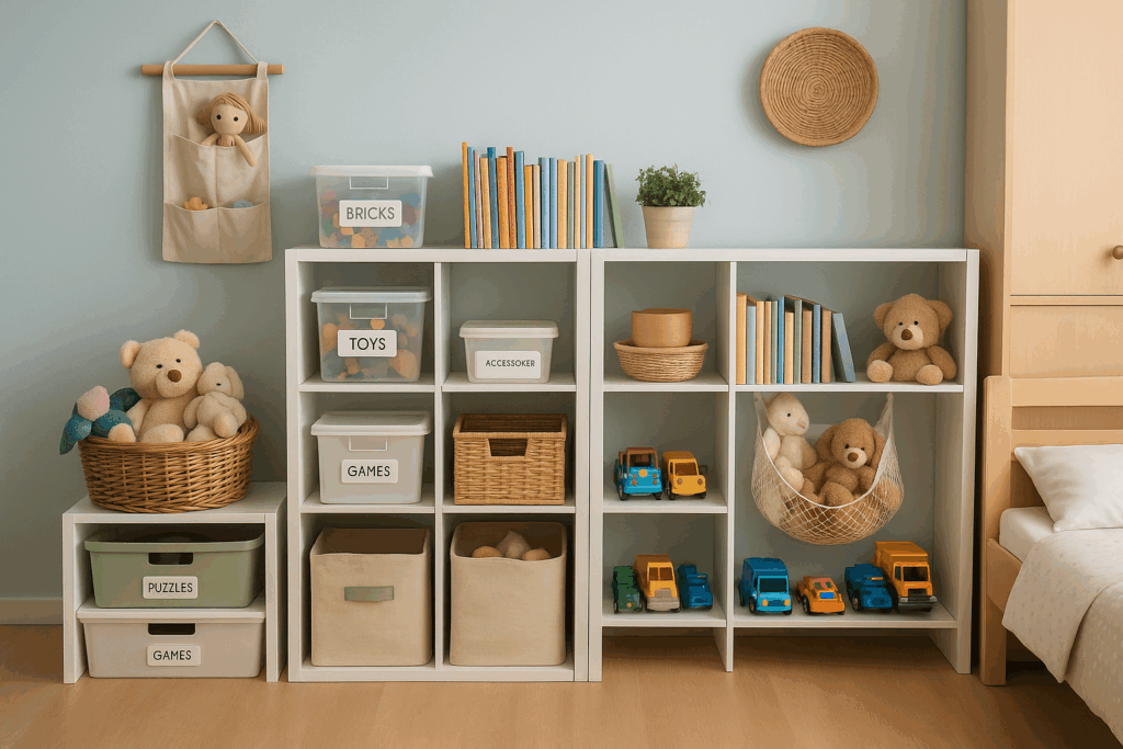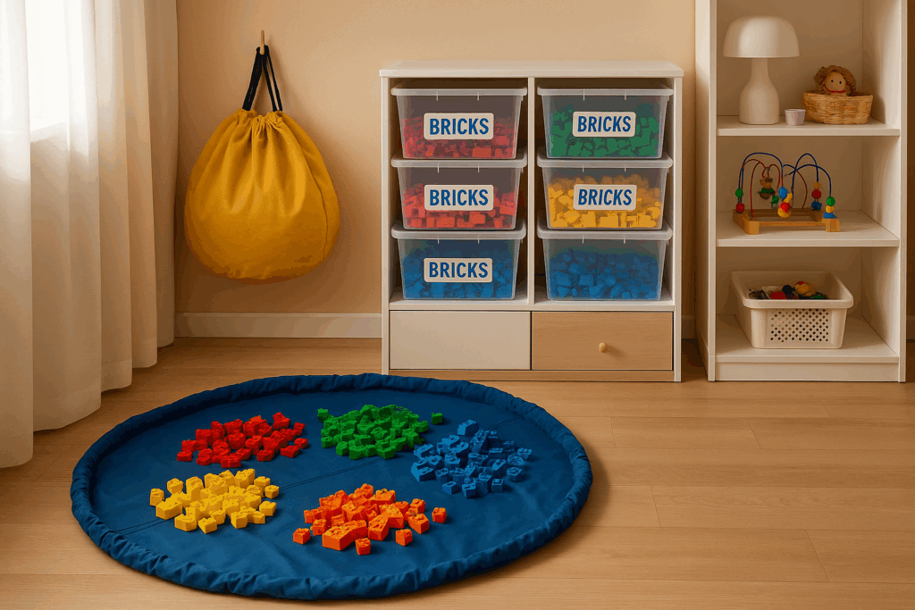 Подберите разные формы и размеры. Большие контейнеры подходят для конструктора, мелкие — для аксессуаров и маленьких игрушек. Подписи на коробках помогают быстрее находить нужные вещи.