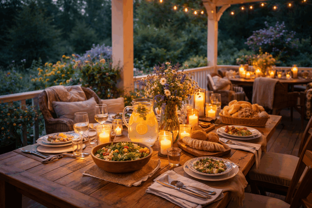 Загородная обстановка сама по себе вдохновляет на красивые приёмы пищи. Завтраки можно украсить букетами полевых цветов, а на веранде создать атмосферный уголок для вечерних посиделок с пледами, свечами и мягким светом. Большие блюда для салатов, кувшины для лимонадов, бокалы, чайные пары и декоративные вазы делают даже простой ужин особенным.