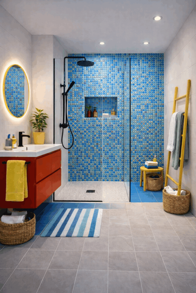 Для зонирования и акцентов часто используется мозаика. Она отлично подходит для оформления душевой, ниш или отдельных участков стены, добавляя интерьеру глубину и выразительность. В сочетании с крупноформатной плиткой мозаика выглядит особенно эффектно.