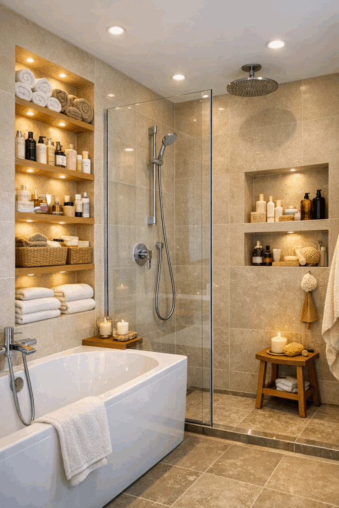 Ниши вообще становятся настоящим спасением для небольших санузлов. В них удобно скрывать коммуникации и одновременно организовывать системы хранения для косметики, полотенец и бытовых мелочей. Такое решение делает интерьер аккуратным и продуманным.