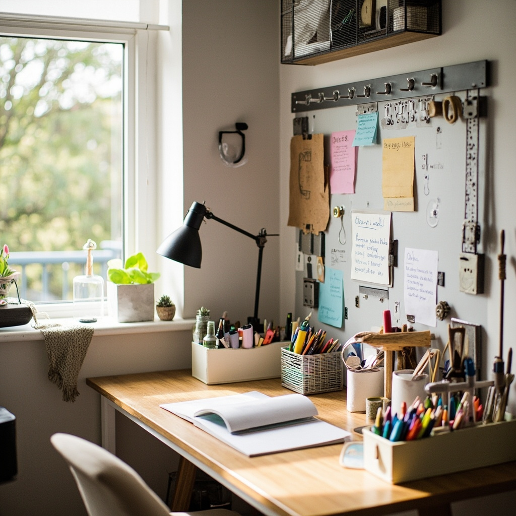 Над столом можно разместить металлическую сетку или перфорированную панель для заметок и аксессуаров. В скандинавских и минималистичных интерьерах отлично смотрятся деревянные панели с колышками. Не забывайте и про рейлинги с крючками — они мобильны и очень функциональны.