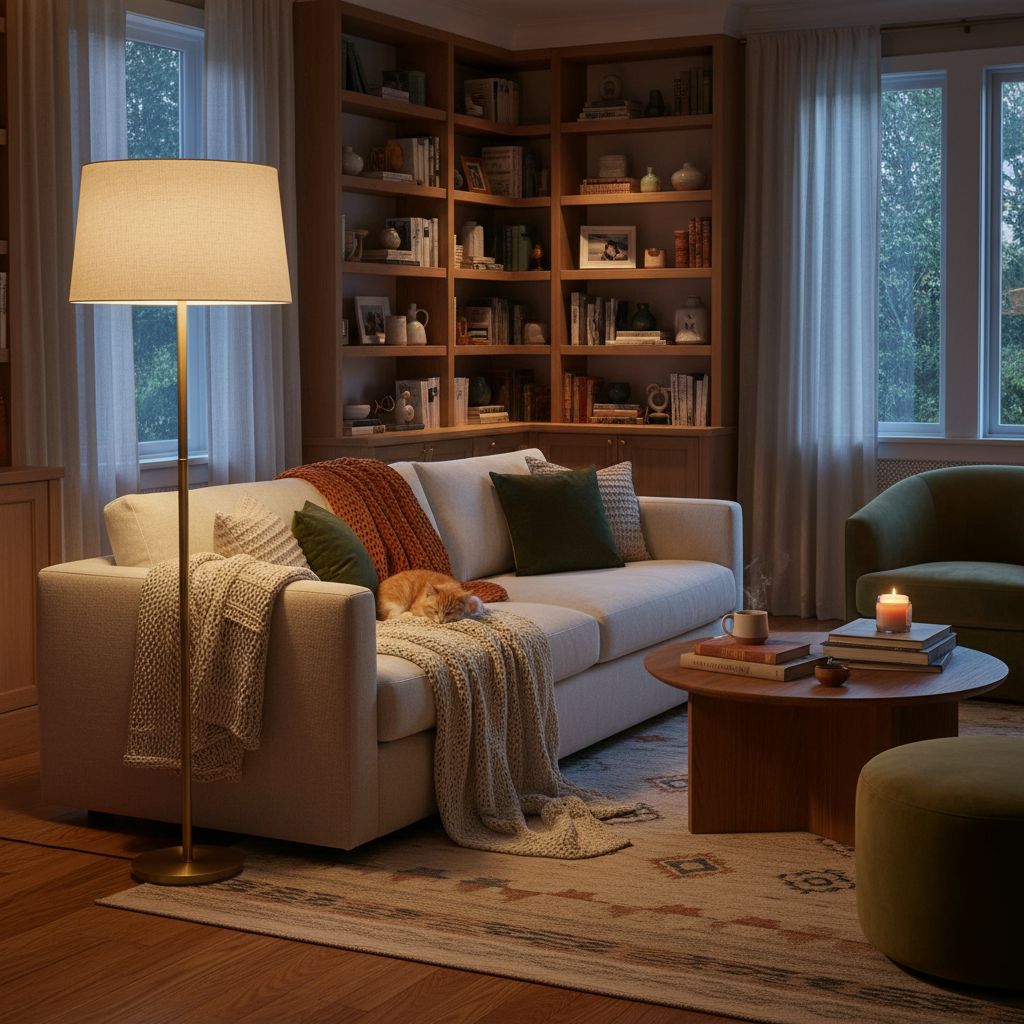 Торшер — один из главных инструментов создания уюта. Он не просто подсвечивает зону отдыха, а формирует настроение всей комнаты. Лаконичная модель на тонкой ножке или дизайнерский светильник с тканевым абажуром дают мягкий, рассеянный свет, который идеально подходит для вечернего отдыха и спокойных разговоров.