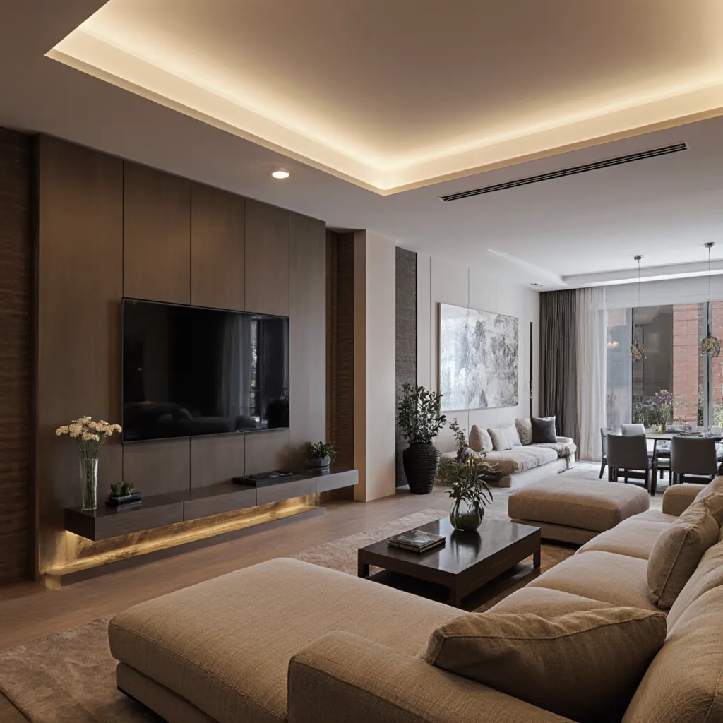 Третий уровень — декоративный. Подсветка ниш, светодиодная лента за карнизом, архитектурная подсветка стен — всё это работает не на задачи, а на атмосферу. Декоративный свет включается отдельно и превращает гостиную вечером в другое пространство. Сюда же относится динамическая подсветка за телевизором: она меняет цвет вслед за картинкой на экране, снижает нагрузку на глаза при просмотре в темноте и создаёт эффект погружения.